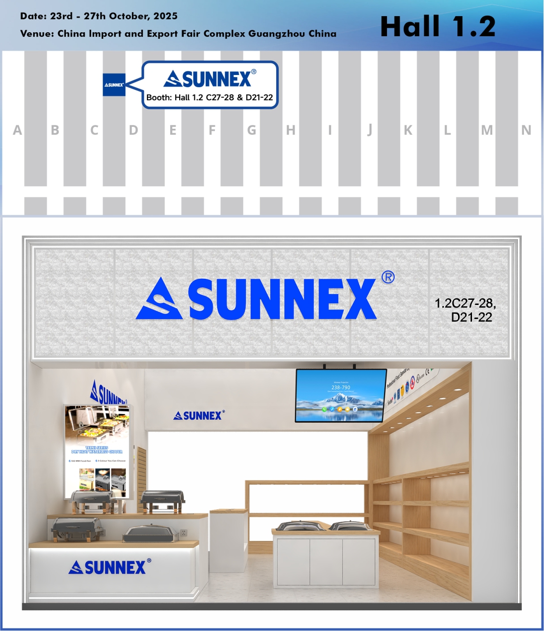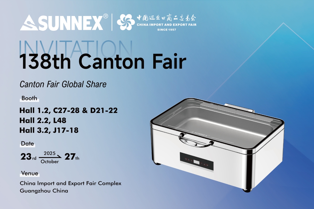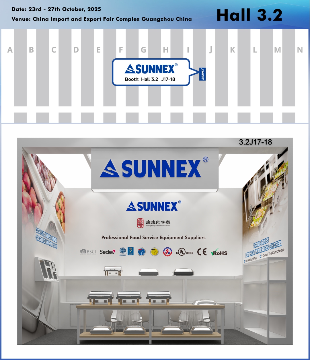 गुआंगज़ौ, चीन - अक्टूबर 2025 - प्रीमियम बुफे वेयर, चाफिंग डिश, ड्रिंक डिस्पेंसर और घरेलू बर्तन की अग्रणी निर्माता, सननेक्स सेंचुरी (शेन्ज़ेन) लिमिटेड, 138वें चीन आयात और निर्यात मेले (कैंटन फेयर) में हमारे बूथों पर आने के लिए अंतरराष्ट्रीय खरीदारों, मीडिया और उद्योग के पेशेवरों को आमंत्रित करते हुए प्रसन्न है।