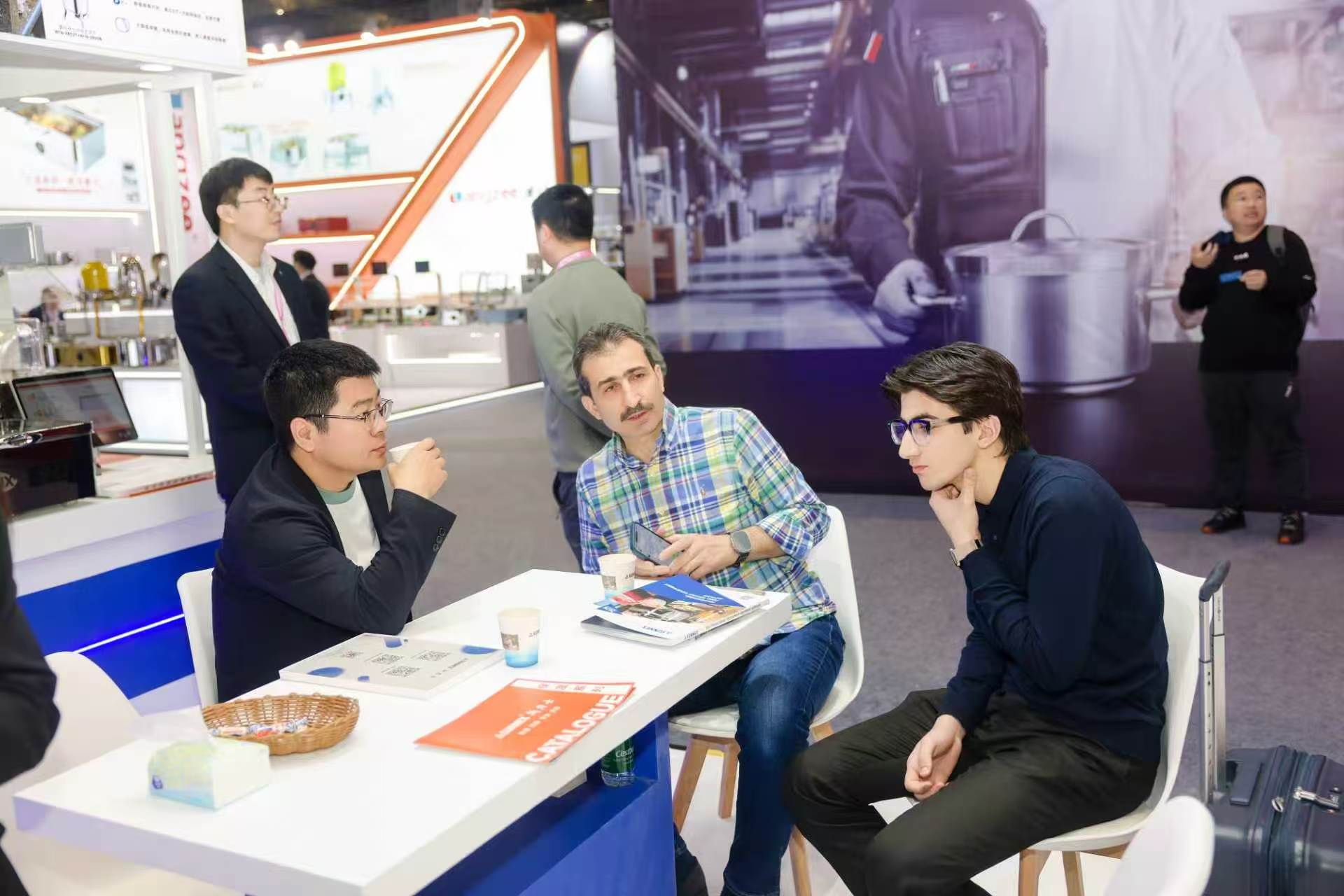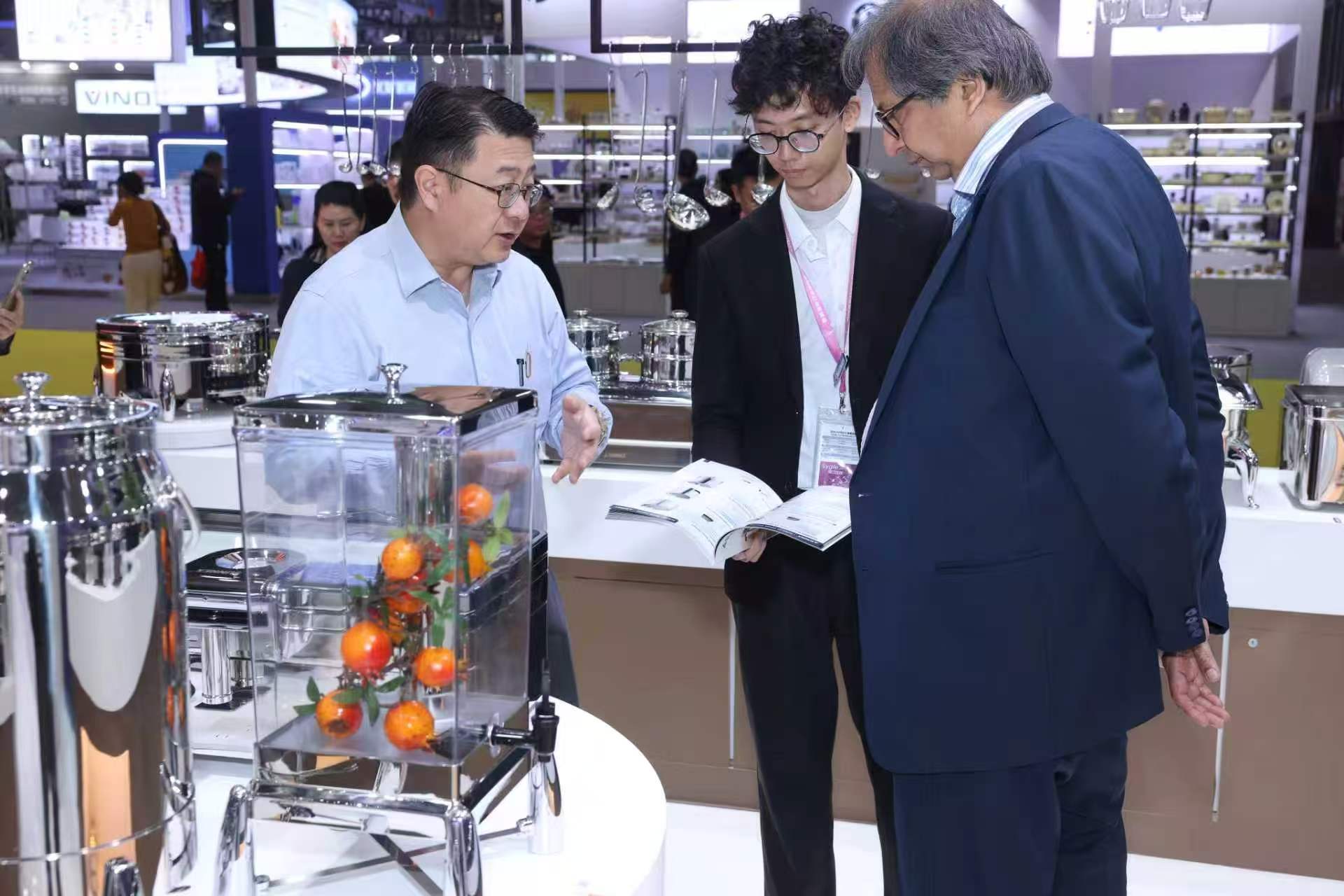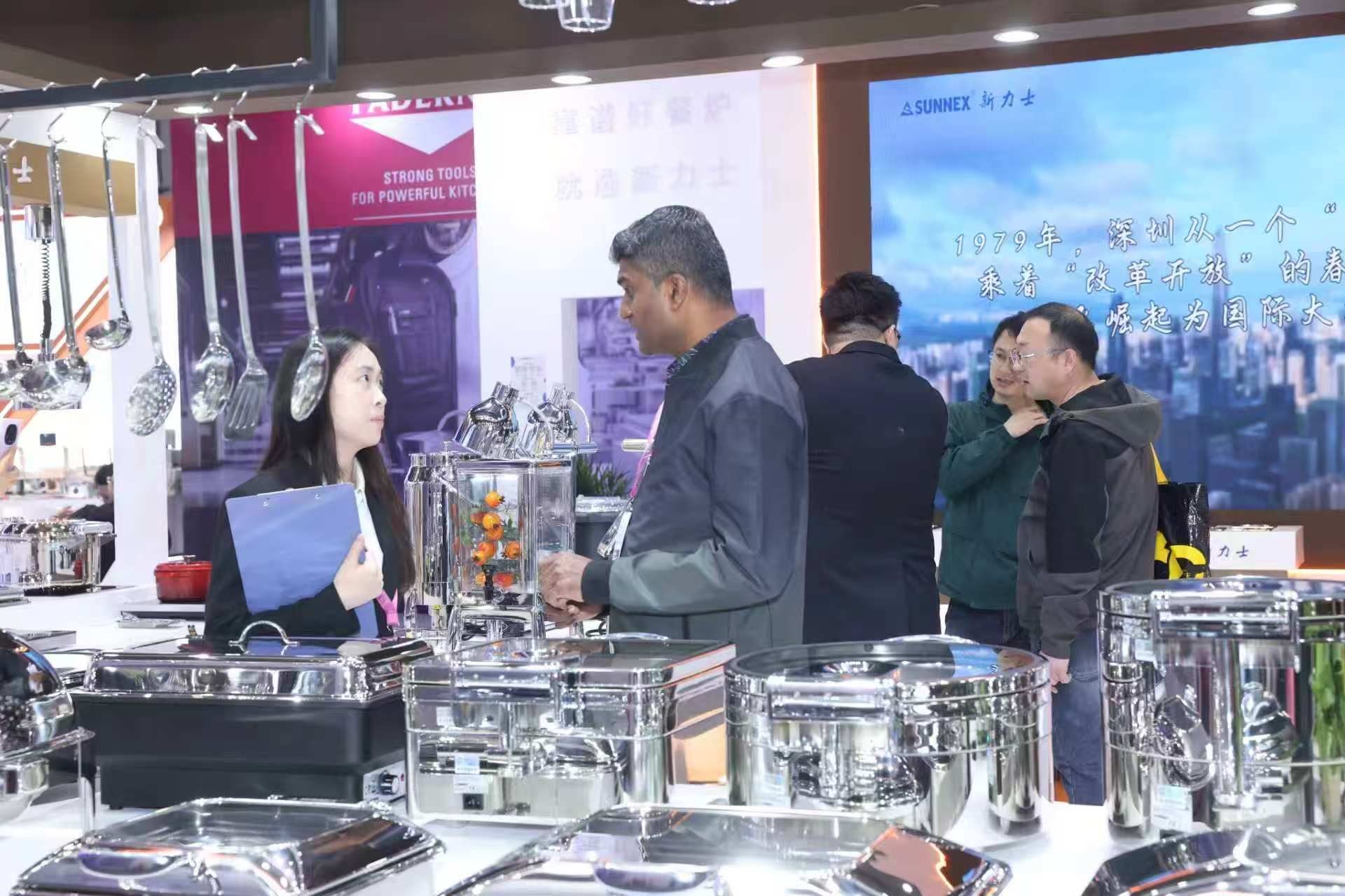 प्रदर्शनी के दौरान, ब्रांड ने हाई-एंड होटल, चेन कैटरिंग ब्रांड और स्टाफ कैंटीन की विविध आवश्यकताओं को पूरा करने वाले पानी रहित सूखे चाफिंग व्यंजन, क्लासिक स्टेनलेस स्टील गैस्ट्रोनोर्म पैन, वेरोना श्रृंखला के दूध के कलश, आइस-ट्यूब पेय डिस्पेंसर और अन्य नए उत्पादों सहित बेस्टसेलर प्रदर्शित करने पर ध्यान केंद्रित किया। हमारे बूथ पर मध्य पूर्व, अफ्रीका, यूरोप, अमेरिका और दक्षिण पूर्व एशिया में पेशेवर विदेशी खरीदारों से लगातार मुलाकातें हुईं। हमारी पेशेवर टीम ने गहन सहयोग चर्चाओं के लिए एक-पर-एक उत्पाद परिचय और अनुकूलित समाधान समर्थन प्रदान किया।